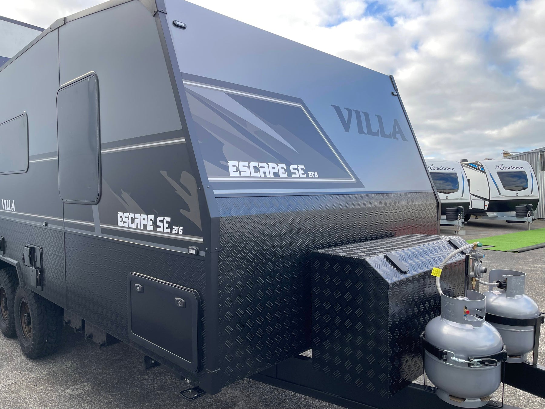 Close-up of a black and gray RV with 'Escape SE' and 'Villa' branding.