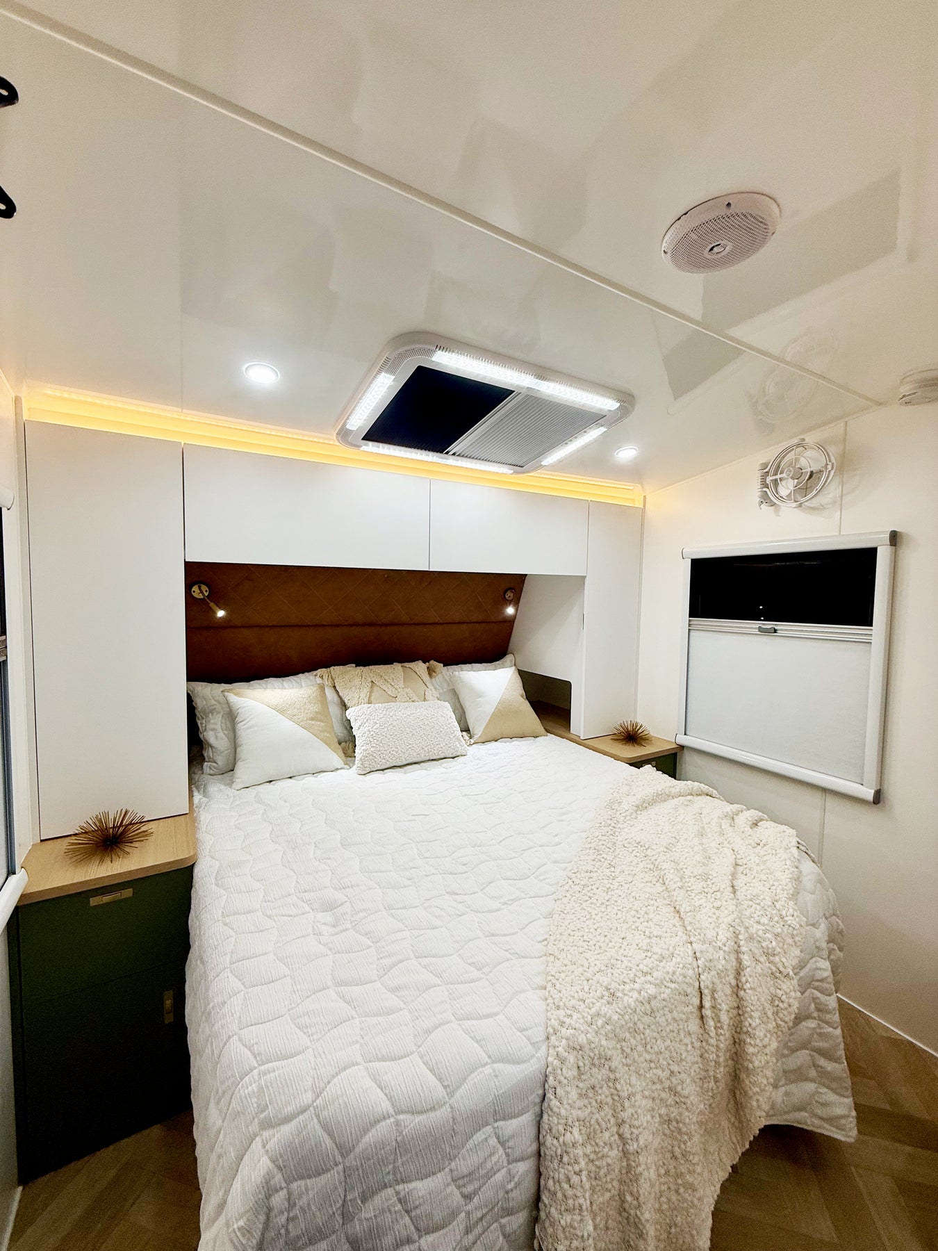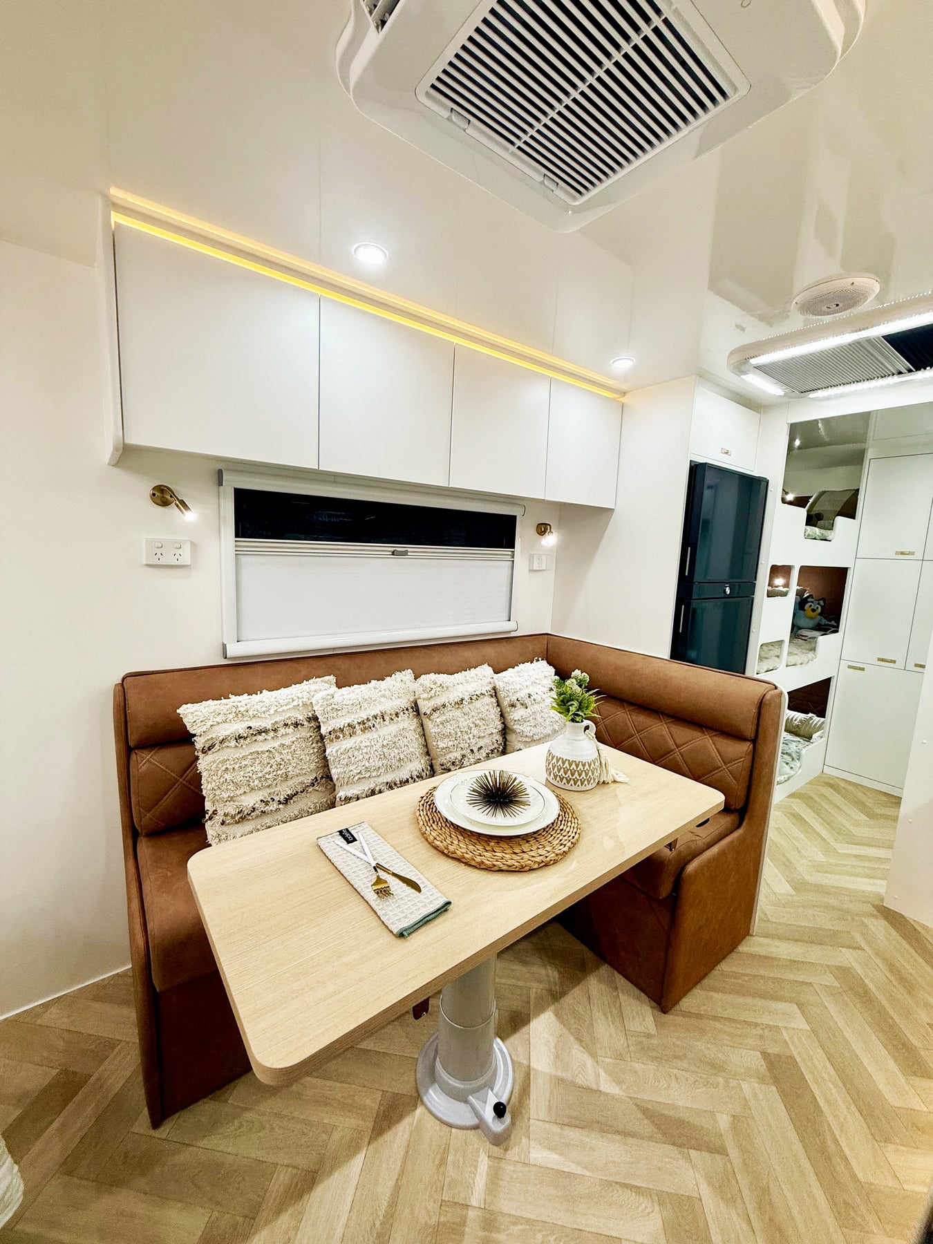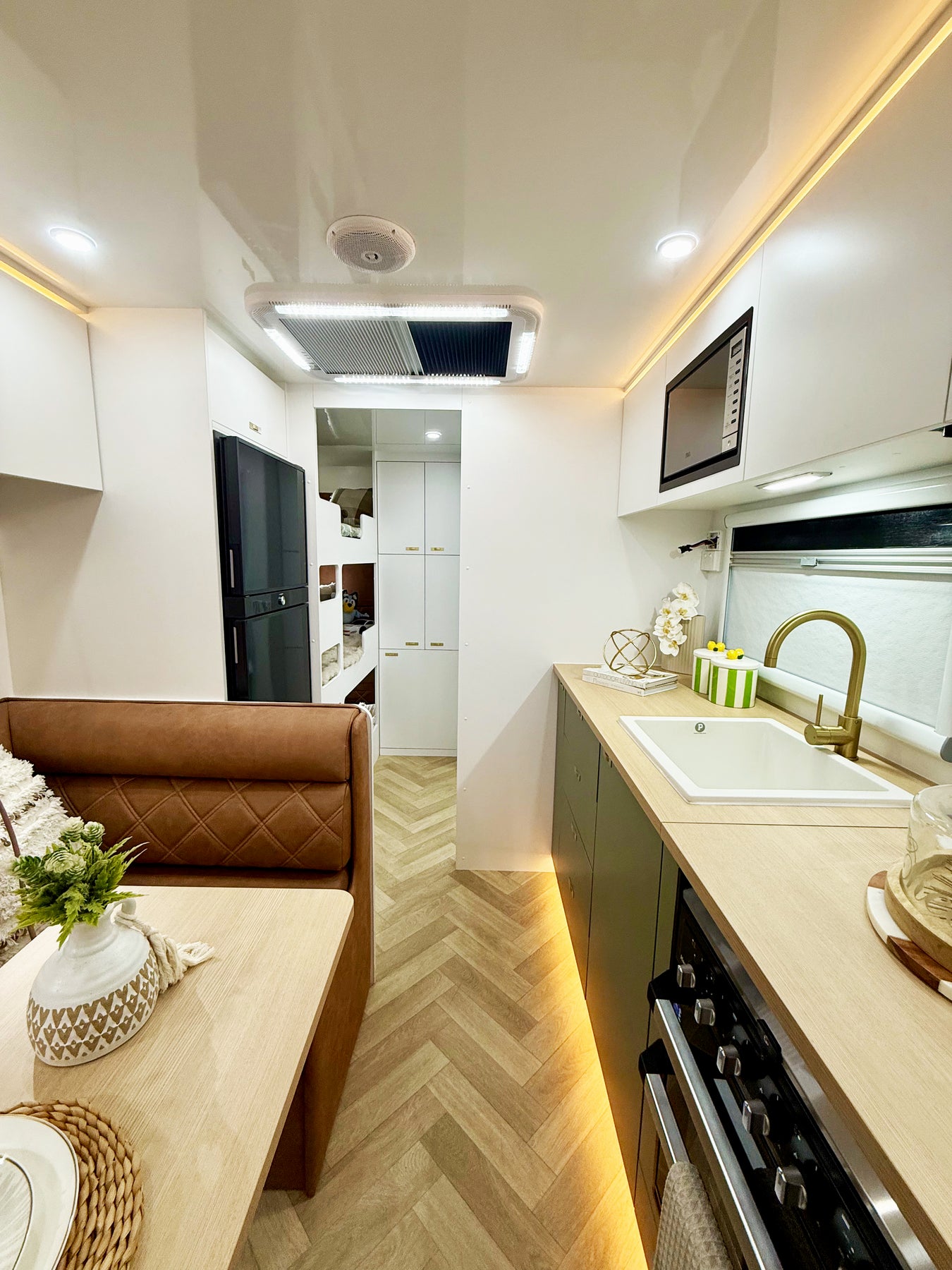 Modern RV interior with kitchen, dining area, and bedroom.
