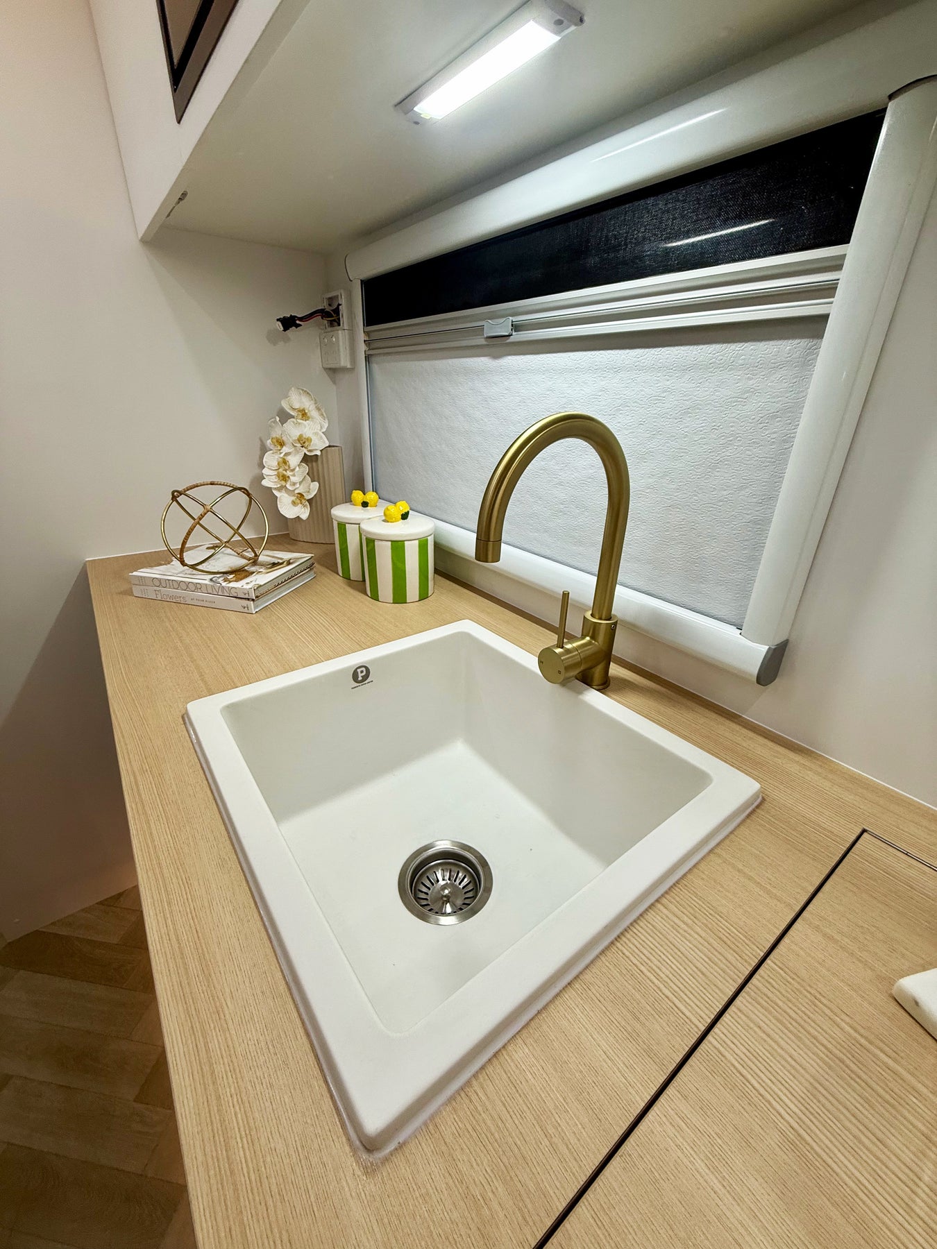 White kitchen sink with gold faucet on a wooden countertop.