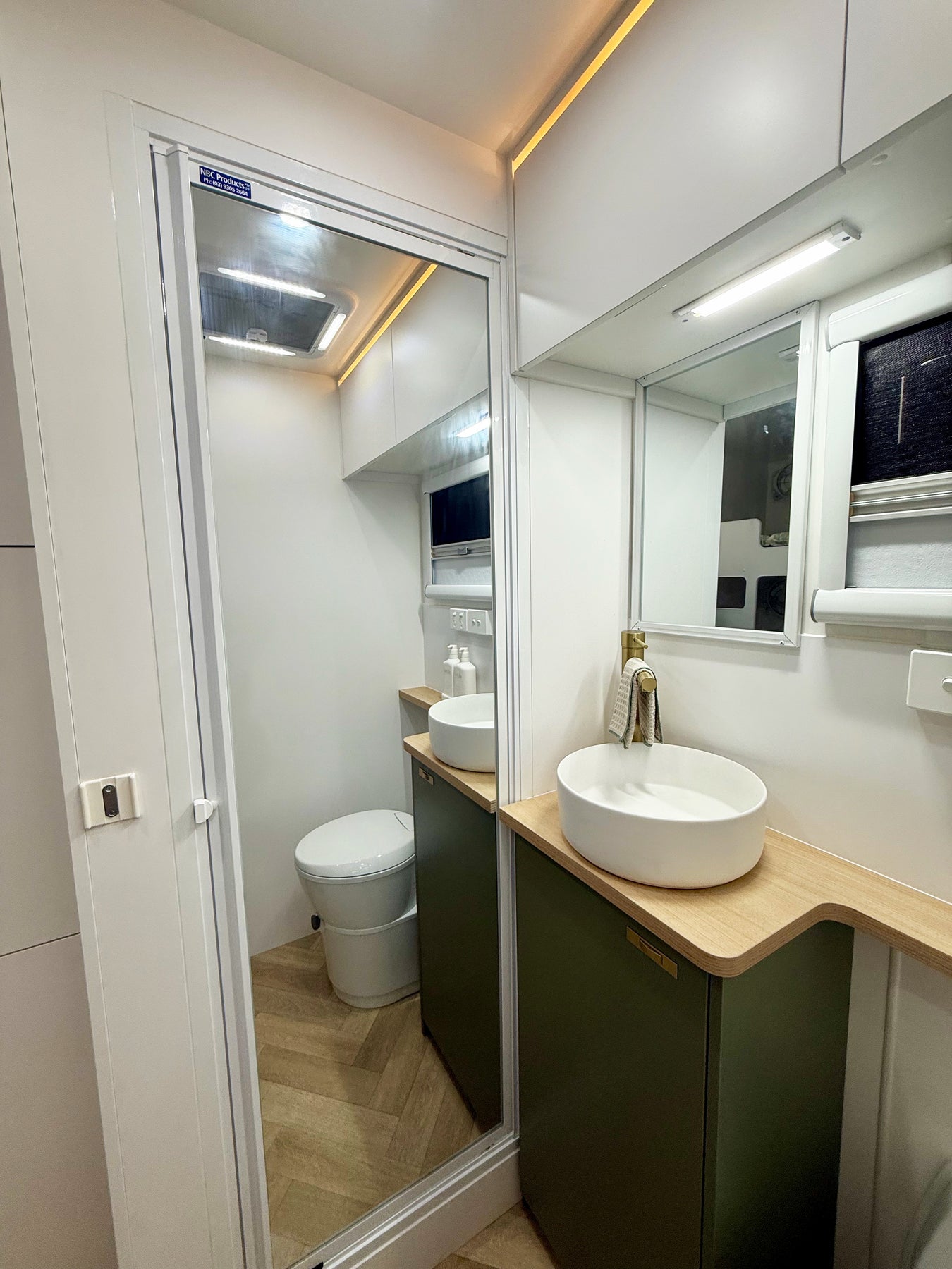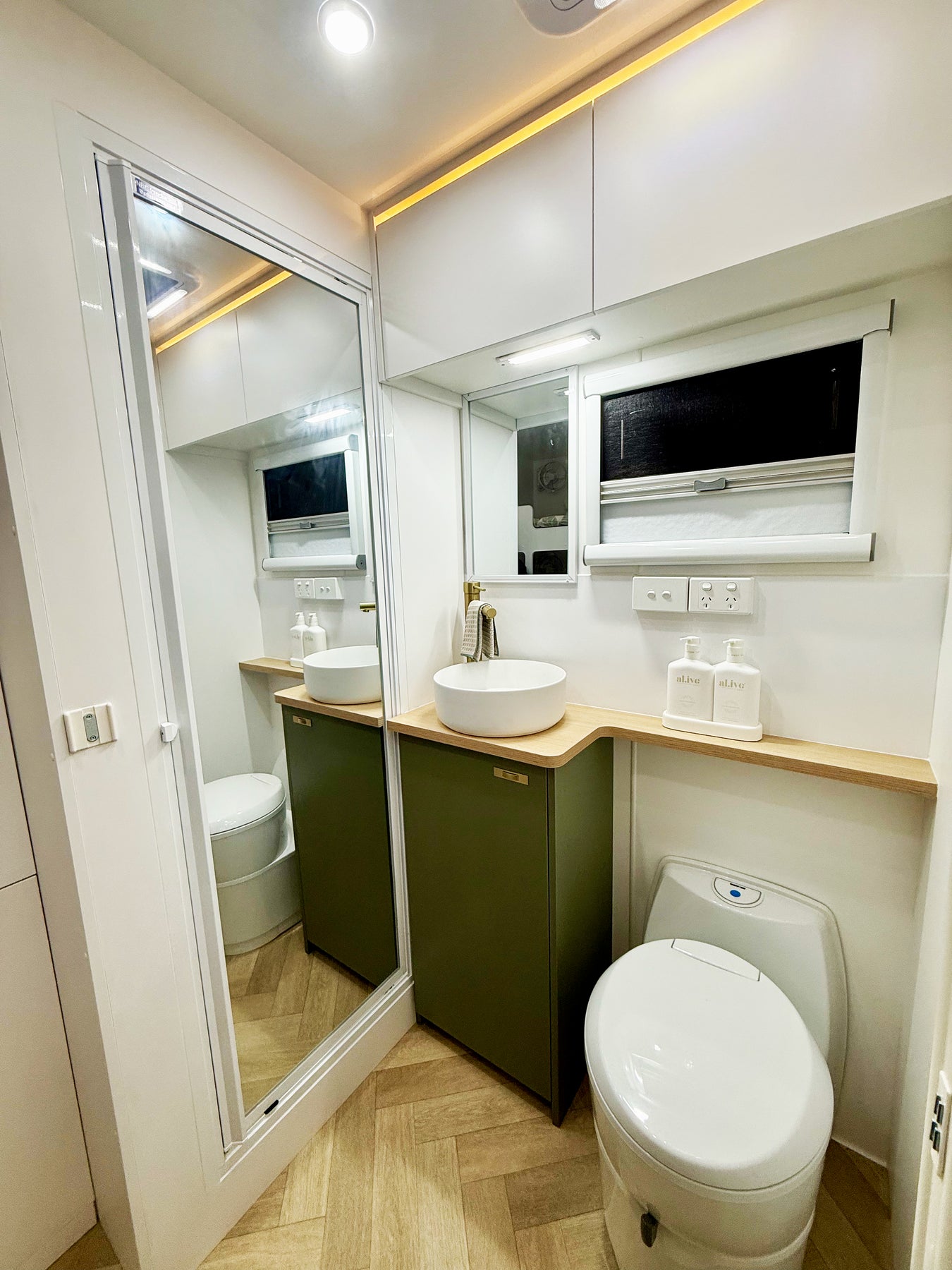 Small living space with bunk beds, cabinets, and a bathroom reflection in a mirror.