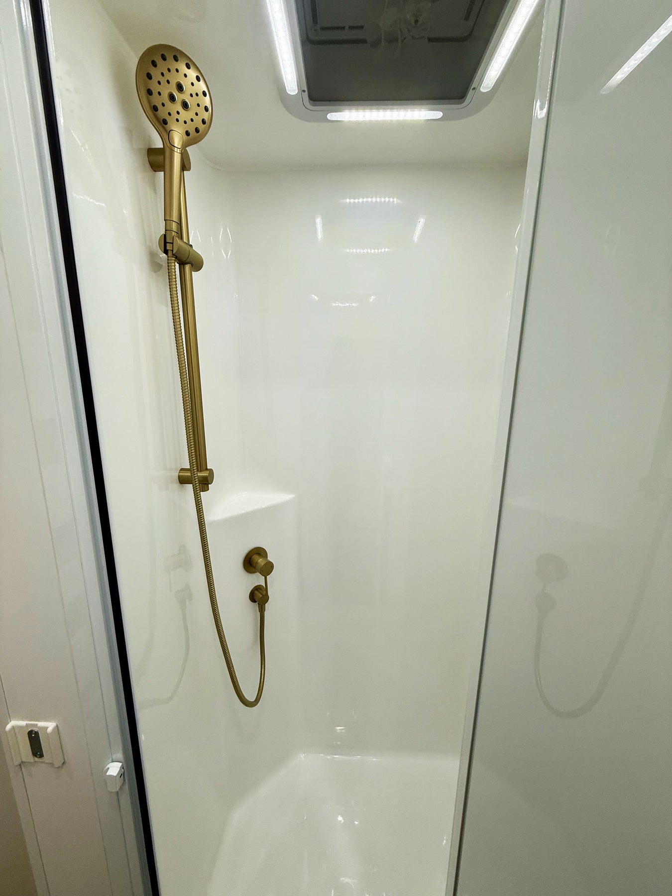 Brass shower head and hose in a bathroom setting
