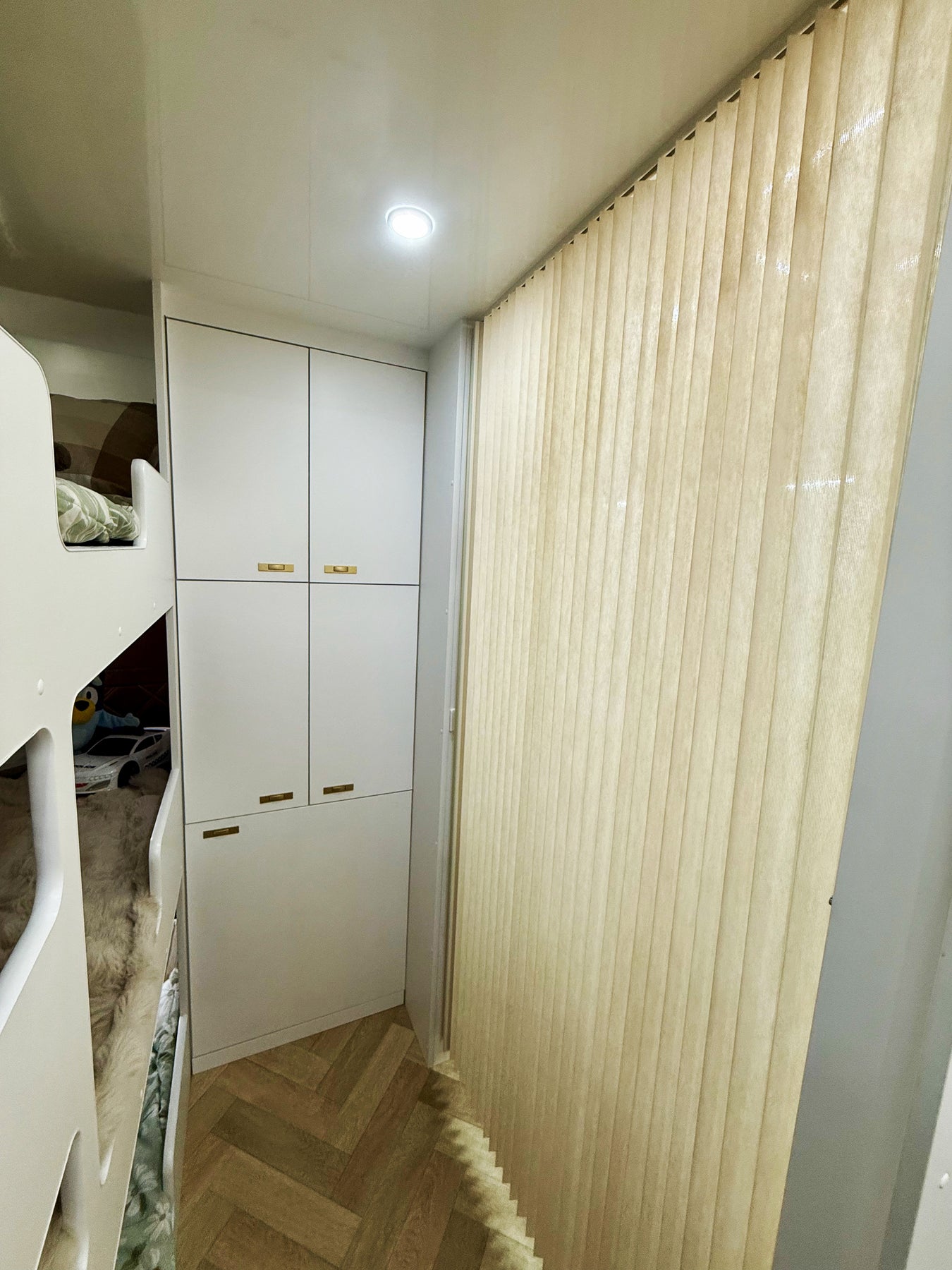 Children's room with bunk bed, white wardrobe, and beige curtain.