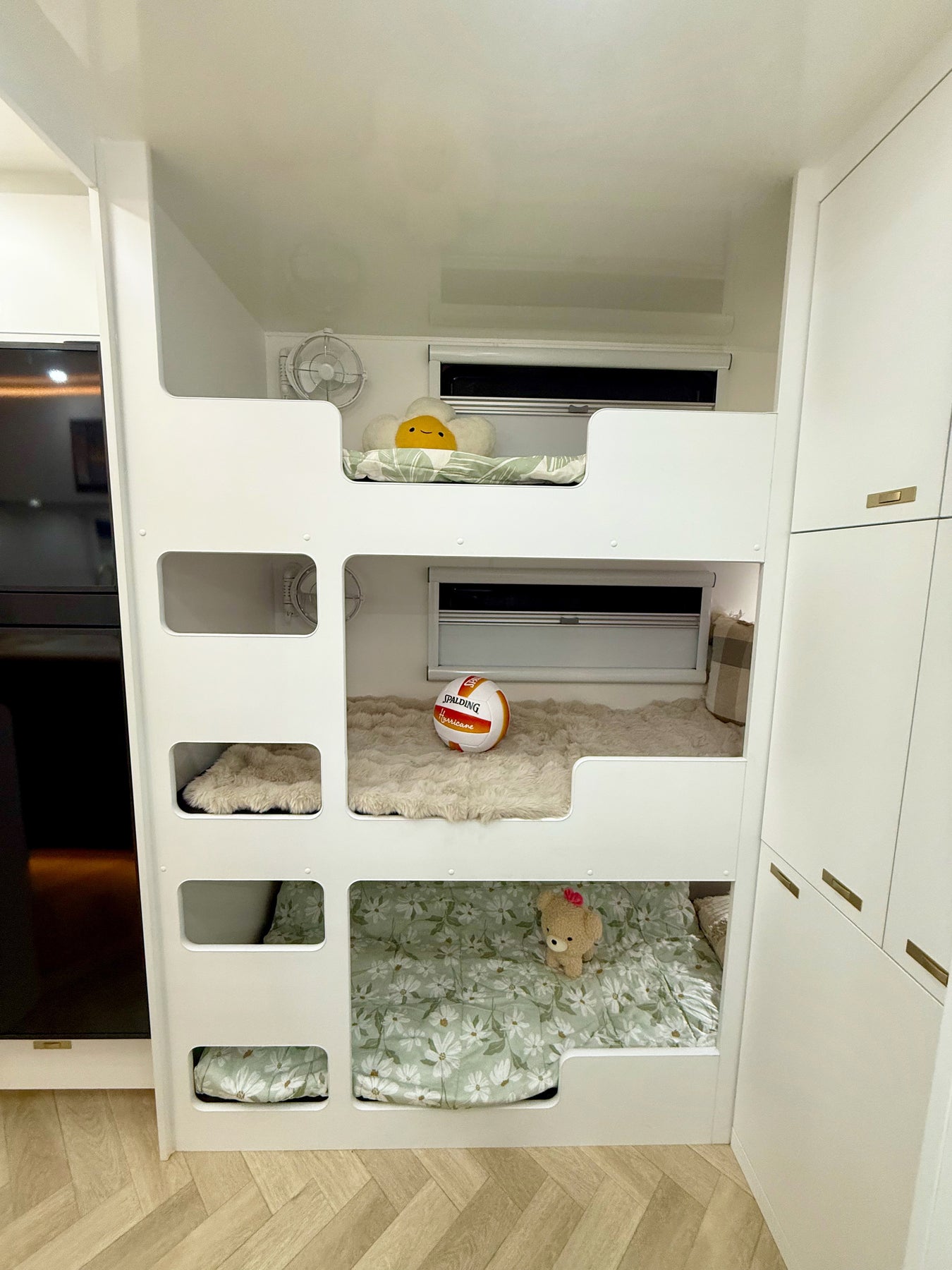 Triple bunk beds with toys in a compact living space