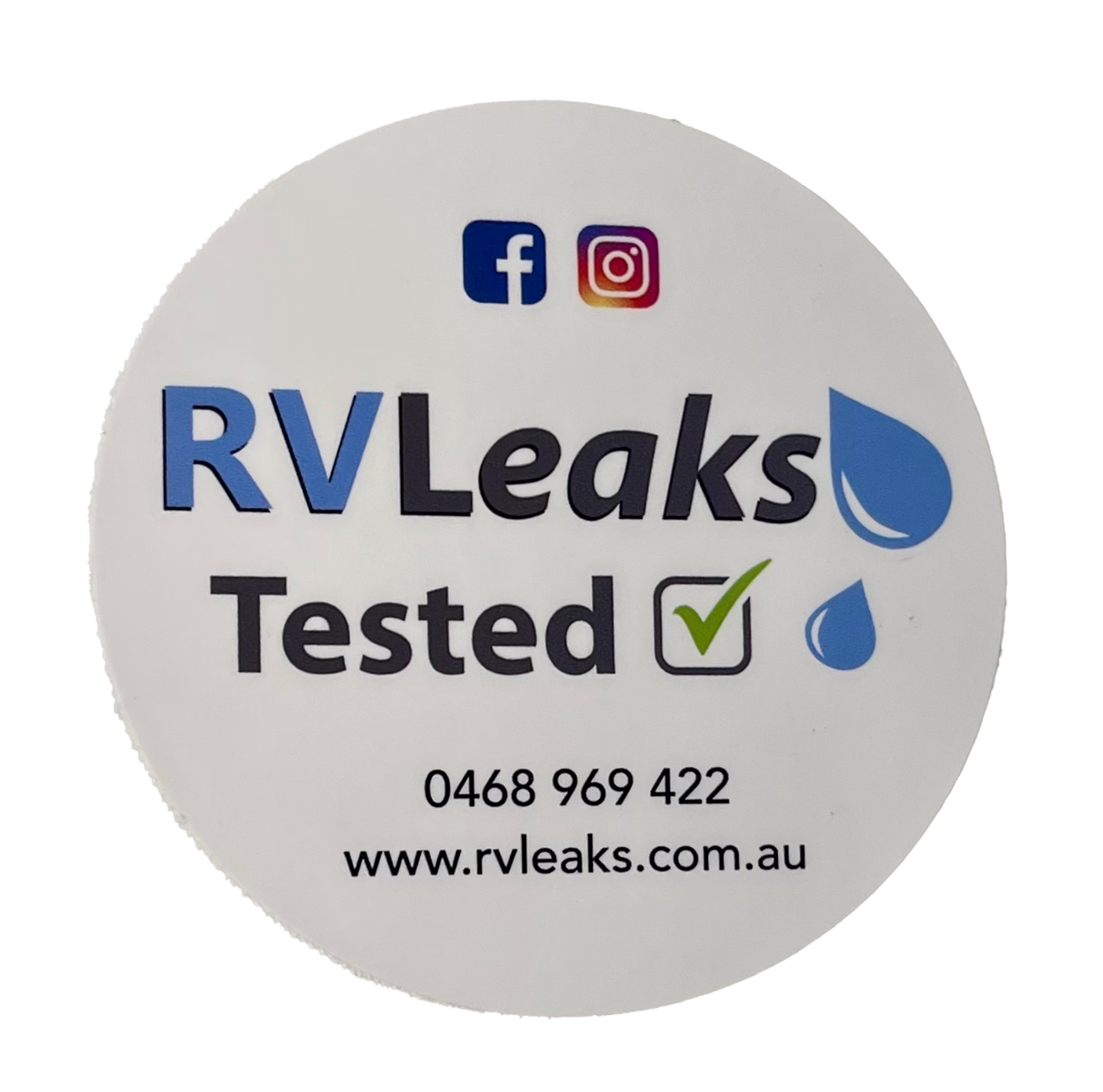 Round sticker with 'RVLeaks Tested' text and contact information on a white background